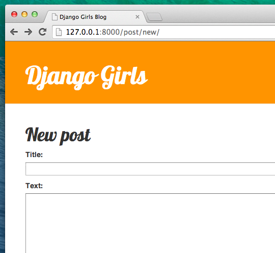 为了创建一个新的Post表单,我们需要调用PostForm(),然后把它传递给模板。 我们会回到这个视图,但是现在,让我们为这个表单快速创建一个模板。